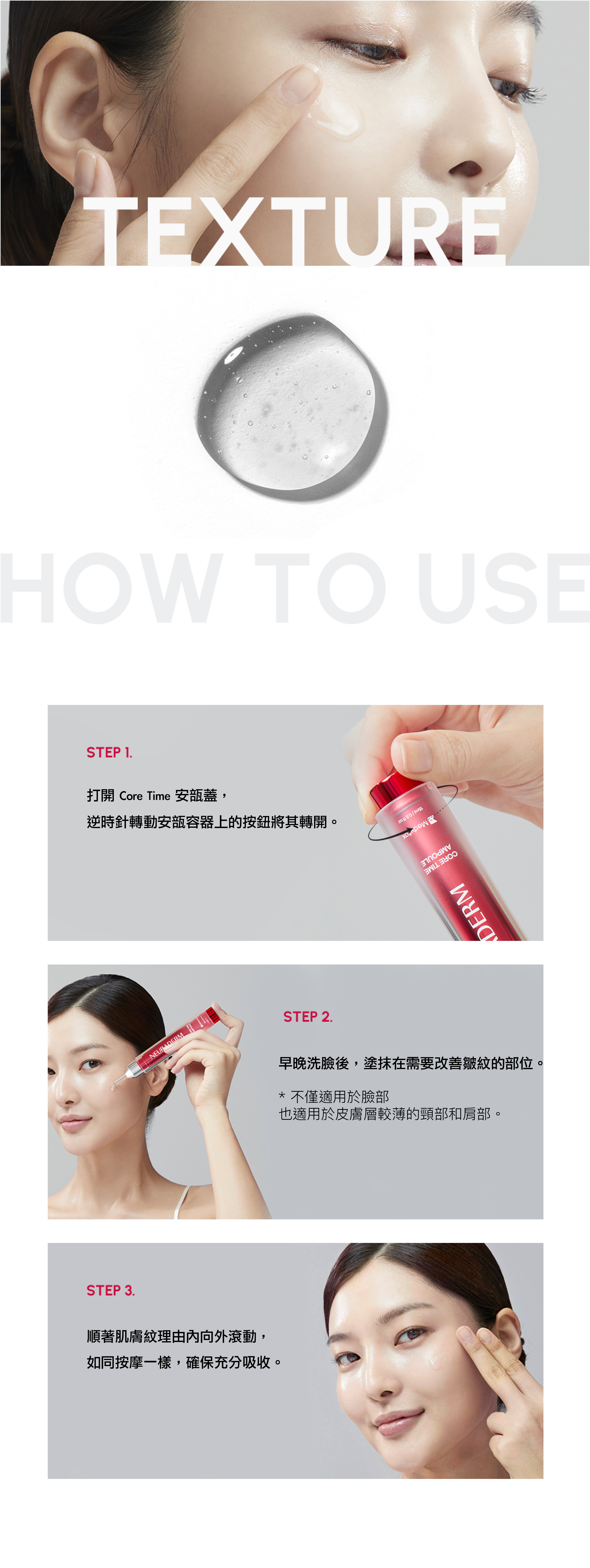 逆時針轉動容器的按鈕 按下按鍵後塗抹在需要改善皺紋的部位 順著肌膚由內向外按摩至吸收