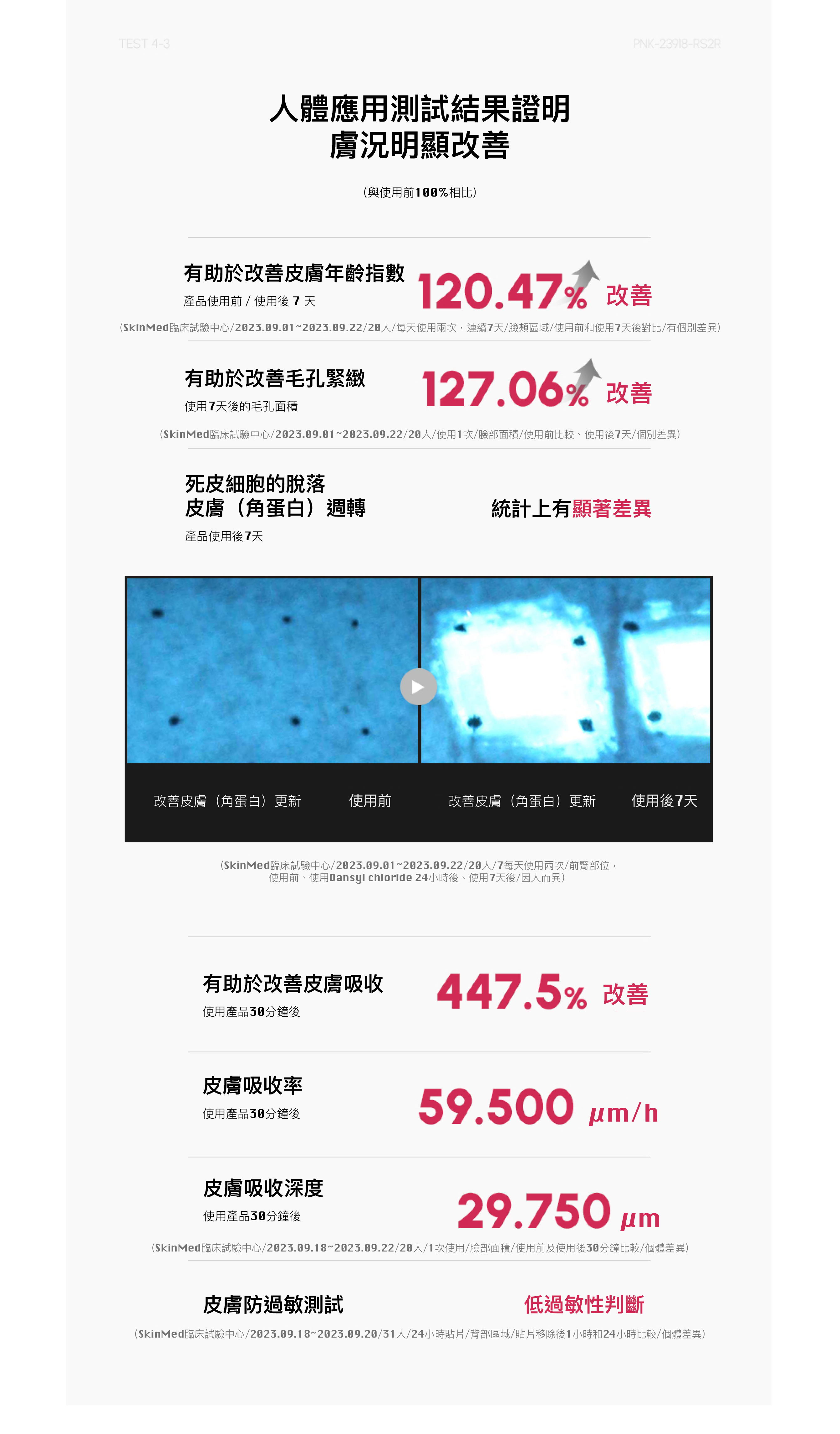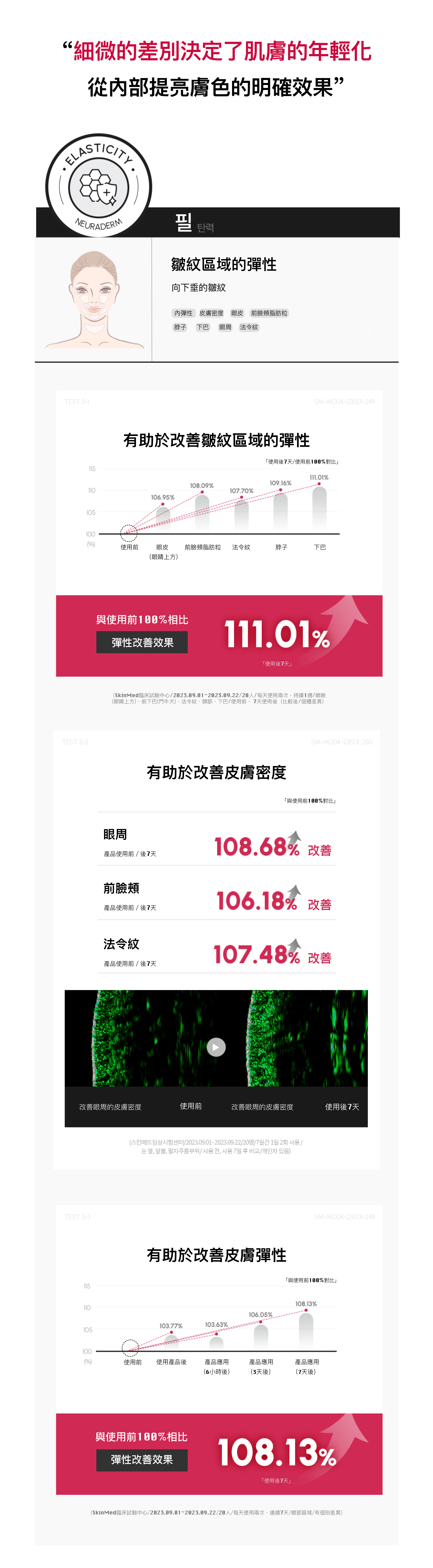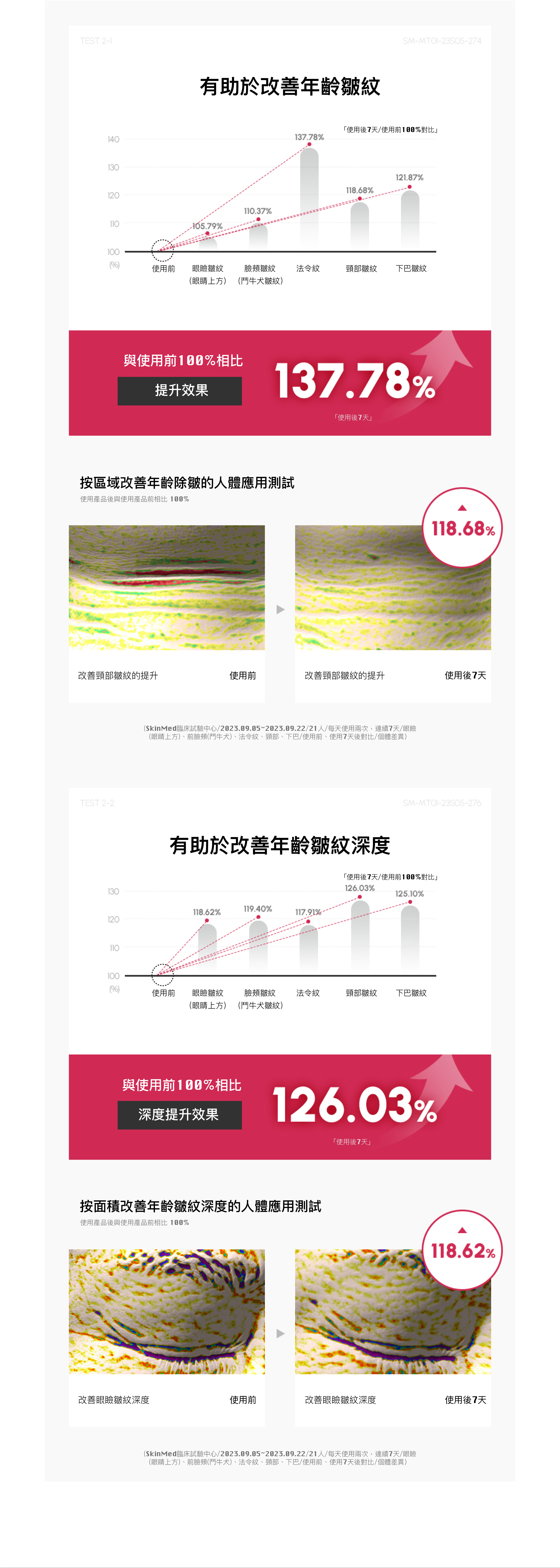 法令紋提升▲ 137.78%、改善法令紋深度▲ 117.91%、改善頸部皺紋深度▲ 126.03%、改善下巴區域的深度▲ 125.1%